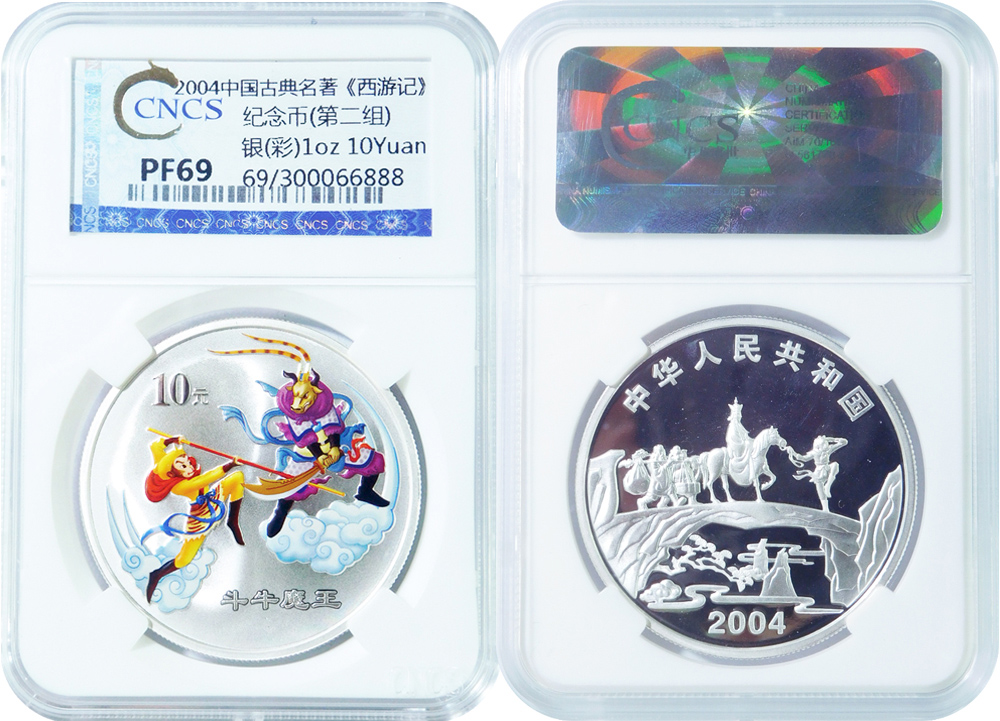 編號:2004-0504-ag-1oz,年號:2004,國別:中國,面額:10元,材質:彩銀,成色:99.9%,質量:精制,重量:1oz,形狀:圓形,直徑:40mm,發行量:38000枚。